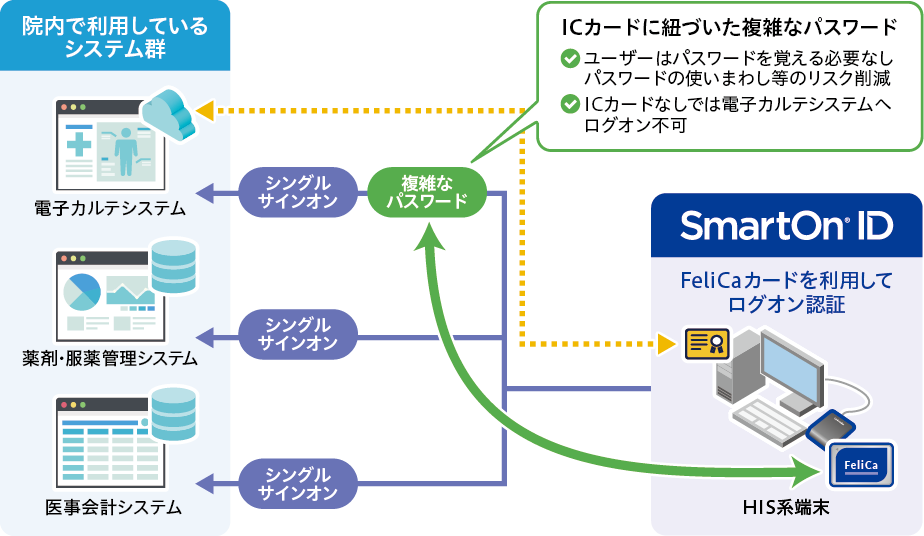 SmartOn IDはWindowsログオンを起点としたICカード認証を実現する。さらに、代行入力機能により、複数の業務システムへの認証操作を自動化することで、現場の手間を抑えることができる。